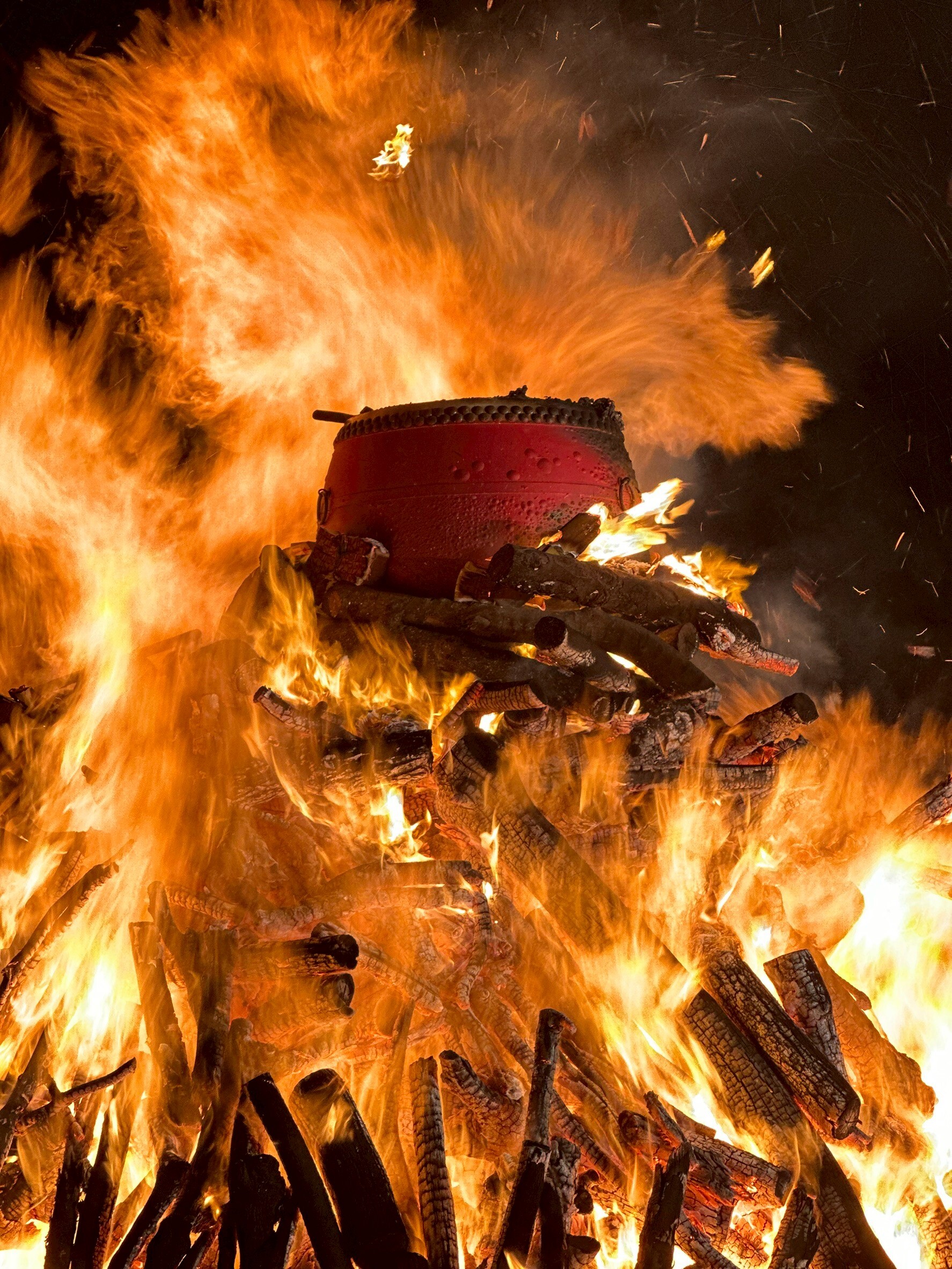 隨著火焰點燃, 鼓神祭的重頭戲正式展開,燃起火堆,送鼓神,祈福新年。